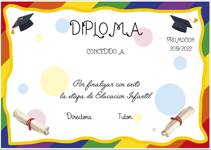 La descarga incluye un documento Word con una única plantilla de Diplomas en castellano para graduaciones para el presente curso escolar en 4 versiones (os enseño también como ha quedado el nuestro).